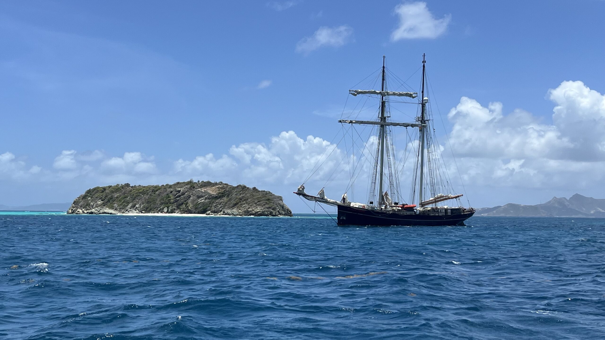 Am nächsten Tag beobachteten wir, wie der Schoner WYLDE SWAN zuerst durch die schmale Passage zwischen Horseshoe Reef und Petit Tabac segelte, also exakt jene Passage, durch welche wir am Vortag mit dem Dinghy fuhren, um dann durch die Riffe von Süden her die Tobago Cays anzusteuern. Ich fand das relativ riskant, zumal noch mit einem so grossen Schlappen, insbesondere, wenn man die starken Strömungen bedenkt. Mit drei Metern Tiefgang ist man schnell aufgelaufen. Die Ausfahrt durch die südlichen Riffe ist hingegen etwas einfacher, da die Sonne von achtern die Untiefen gut beleuchtet. So fuhren auch wir durch die südlichen Riffe auf direktem Weg nach Clifton Harbor auf Union Island. Der vor ein paar Wochen gestrandete Katamaran von Dream Yacht Charter war inzwischen von Riff geborgen worden.